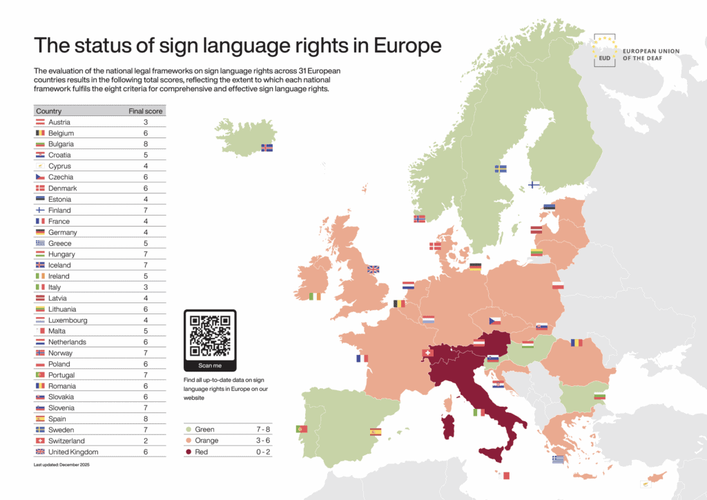 This publication also integrates visual data developed by EUD, offering a clear and accessible overview of the state of sign language rights across Europe. These visual resources complement the legal analysis and are designed to support advocacy, policymaking and public understanding of the path from recognition to officialisation.